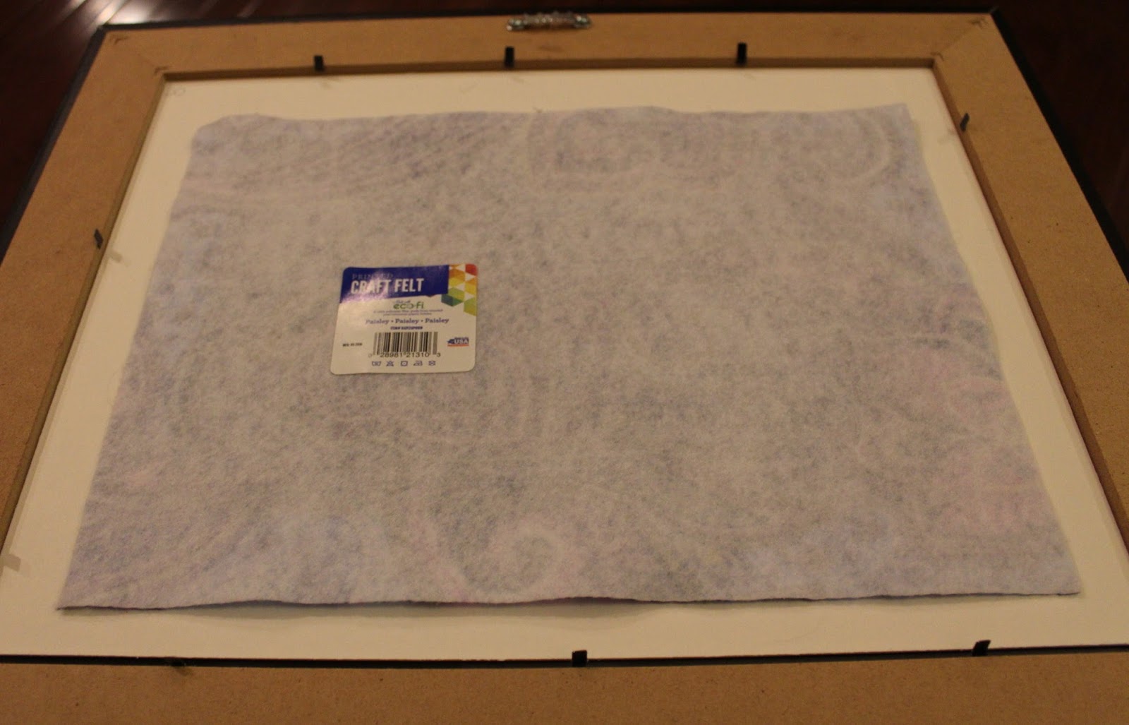 This assembles in seconds. Place the fabric or paper into the frame where the photo would normally go. Once the the material is centered, put the back of the frame in place. That’s it, you’re done. What’s nice about using a photo frame is that the hanging hardware is already attached to the back so it’s ready to frame without extra effort.