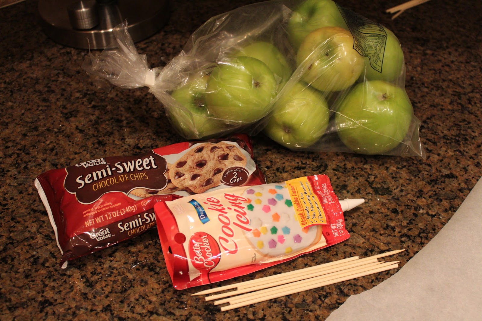 The apple slice process the the same as the marshmallow pops. You need 3-4 apples, a bag of chocolate chips, white icing, and kabob sticks.