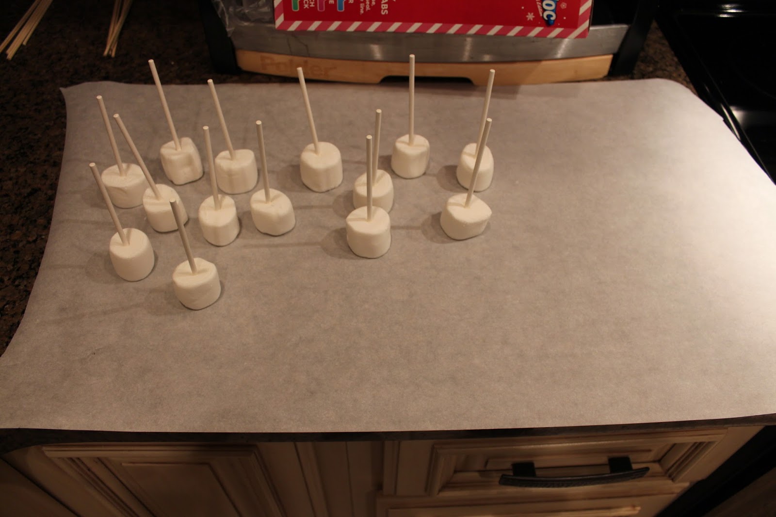 Prep your ingredients on parchment paper. I like parchment because it is white and creates a clean working surface and also once the pop is dipped in the chocolate, return it to the parchment for hardening without sticking. Place a lollipop or kabob stick into each marshmallow and group them for dipping.