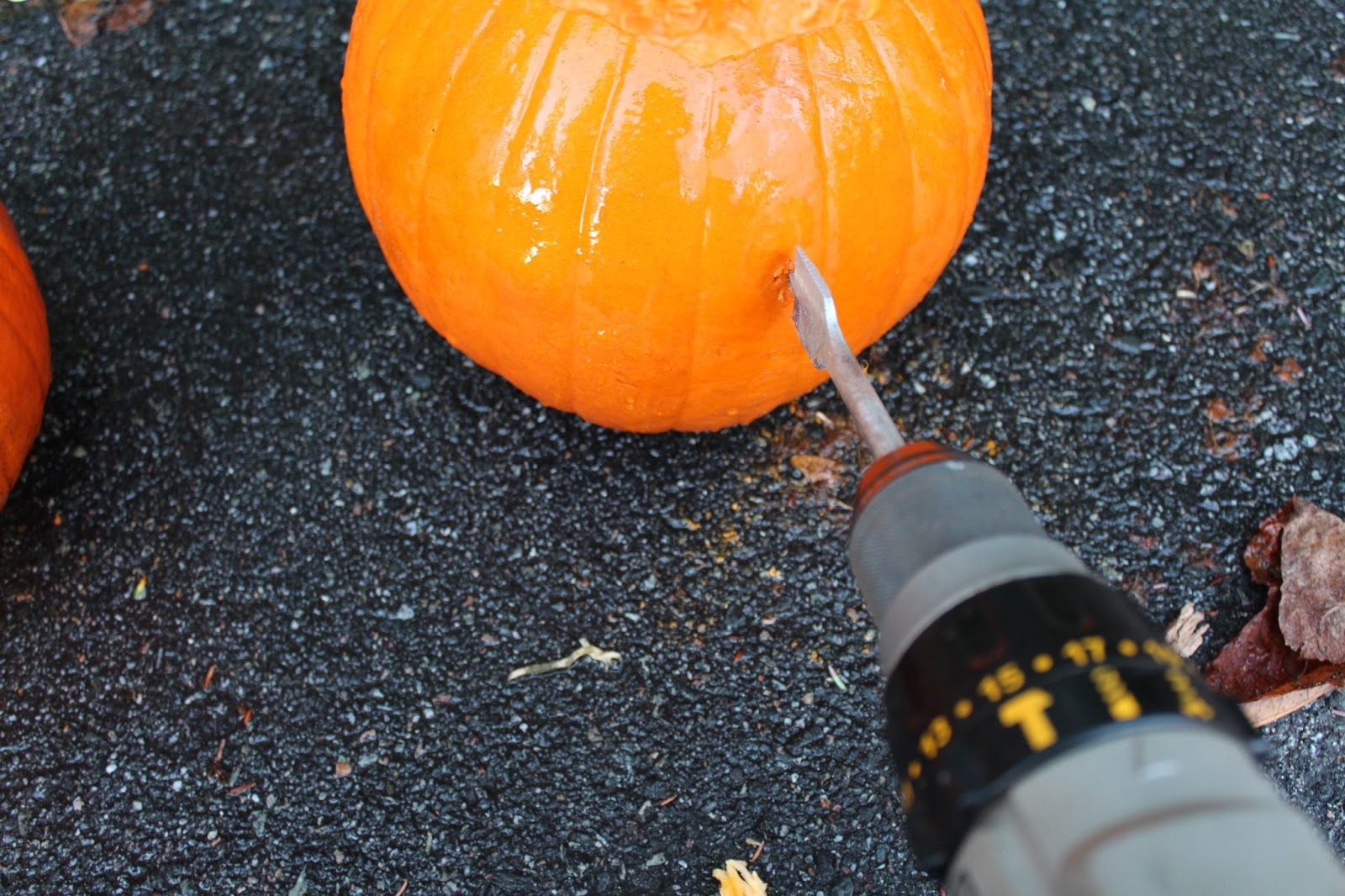The Effortless Girl pumpkin carving technique takes much less time and is far safer than those sharp knives and a trip to the emergency room. Grab a drill and let’s get started on some Power-Tool Pumpkins. This is not rocket science. You do need to go outside for this task, it can be extremely messy. You’ll need a drill with bits in several sizes, a knife, and a spoon — plus your pumpkin.