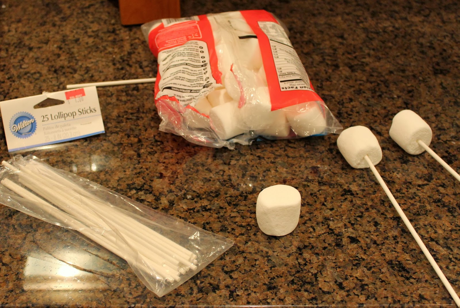 Go ahead and prepare your marshmallows for either pops or sleds.  For pops, place the marshmallows onto the end of the stick.  For the sled, arrange the candy canes side by side ahead of time for simplicity in assembly.