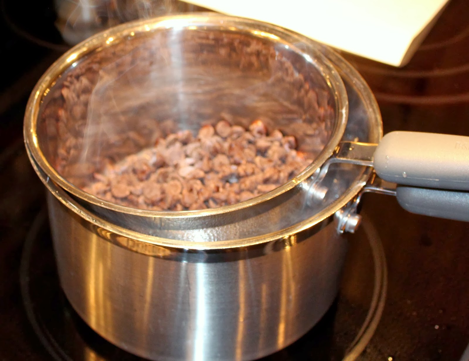 Melt the chocolate in a double boiler on the stove on low heat. If you don’t have a double boiler, don’t worry. I improvised stacking two different sized pots together. It isn’t pretty, but it is completely functional for our purposes. We are not professional chefs. Stir the chocolate as it melts and continue to periodically stir it so it doesn’t stick to the bottom or the sides of the pot.