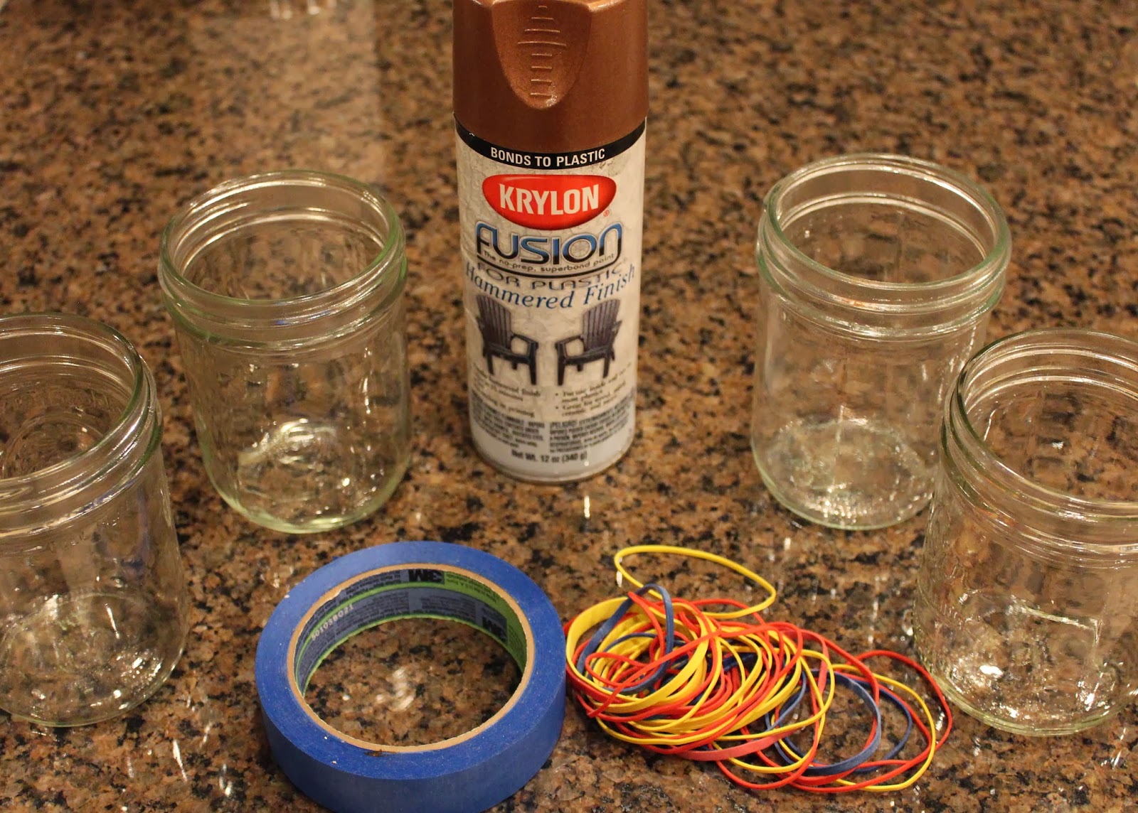I started with old jars. You may use jars, old drinking glasses, or vases – whatever you may have on hand that is an interesting shape. You will need rubber bands and spray paint. Choose a color that you like, you can tailor the color to any holiday or occasion you want. I also had an idea to try painters tape for striping an old jar.