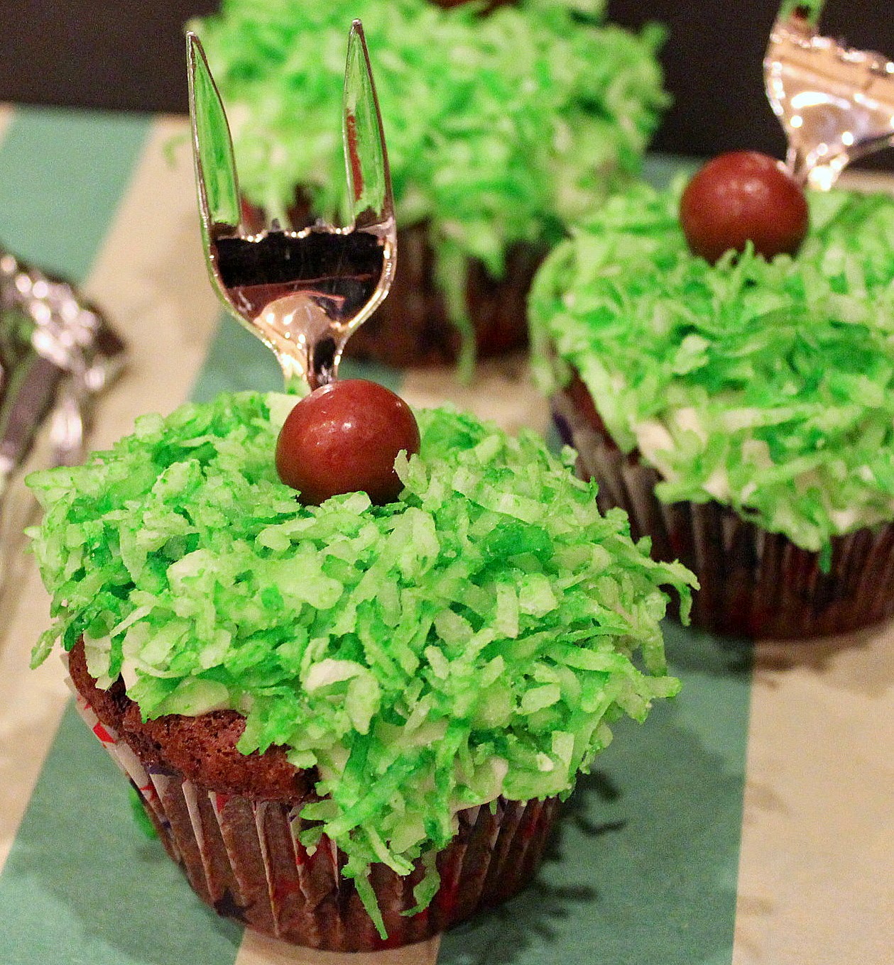 Make the brownies and the cupcakes. While they are baking pour a bag at least 2 cups of shredded coconut into a bowl. Add a few drops of green food coloring to the coconut and stir.