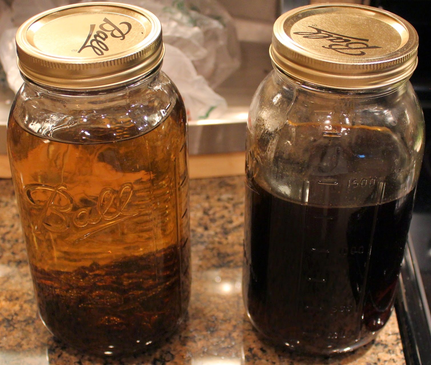 Tightly seal the jar. Give it a shake and place it in the back corner of your pantry. It doesn’t need to be exposed to lots of light for the next few months. The jar needs to sit for at least 30 days before the vanilla is ready to use. After that, it can age for a long, long time. Below is the new jar on the left and an old jar that I made two years ago on the right. Note the color difference.