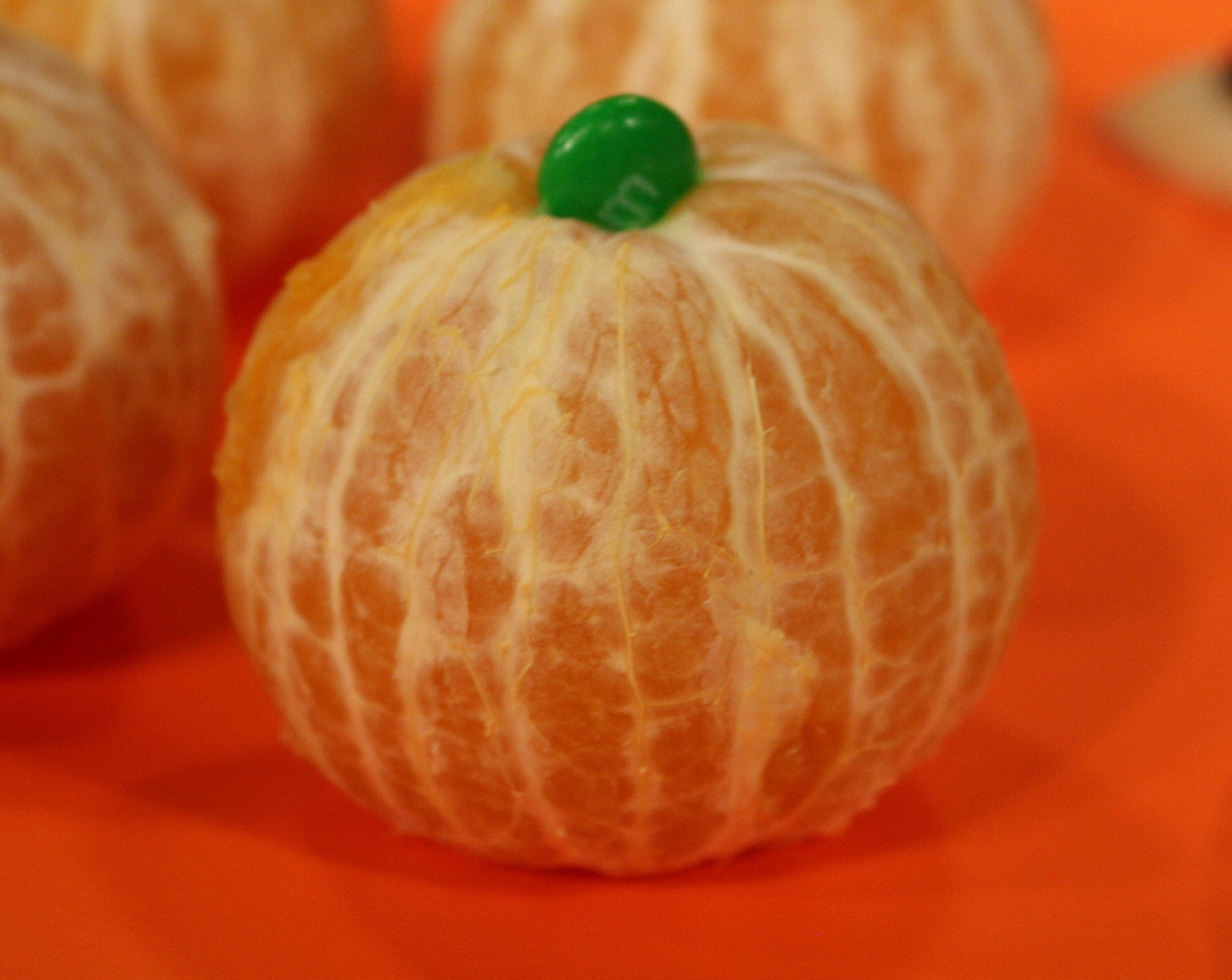 For the Party Pumpkins, peel a tangerine or clementine and make a small notch in the top (if the core doesn’t come out during the peeling process). Place a green or brown M&M candy in the notch at the top for the stem. Oranges are fun to eat and packed with Vitamin C.