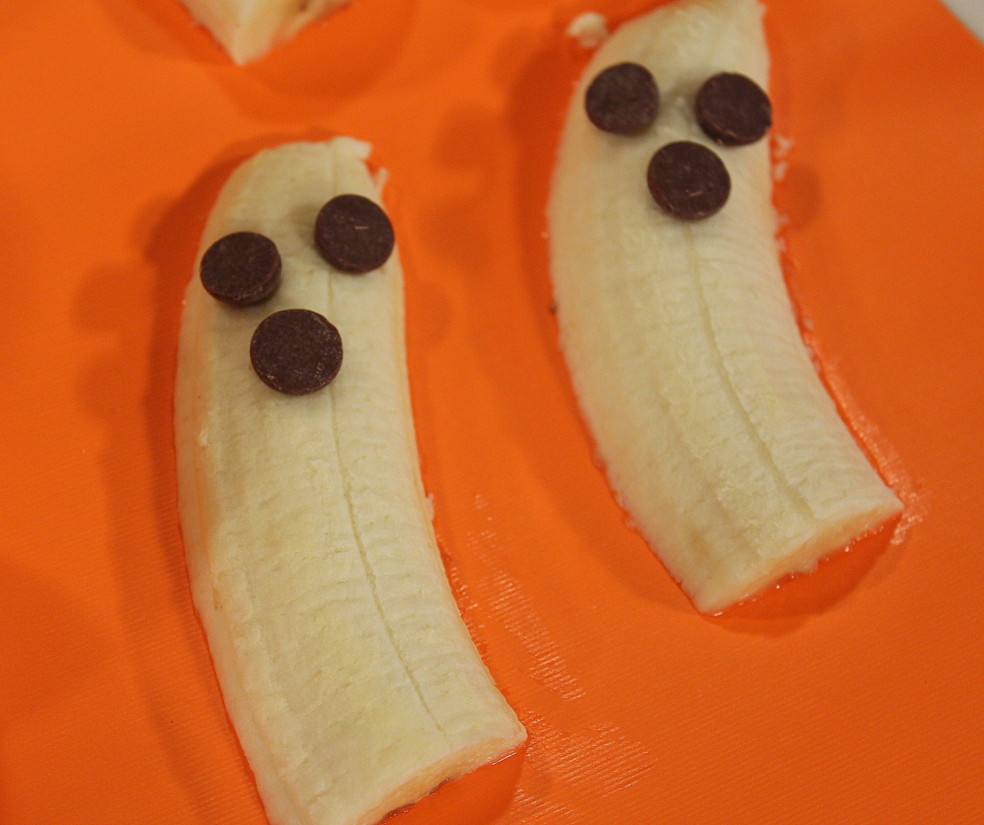 The Boo Bananas are simple also. Cut one banana in half. Then slice the halves in half. Place the flat sides onto a plate and press three chocolate chips (flat side up) into the banana as the two eyes and one mouth into the pointed end of the slices.