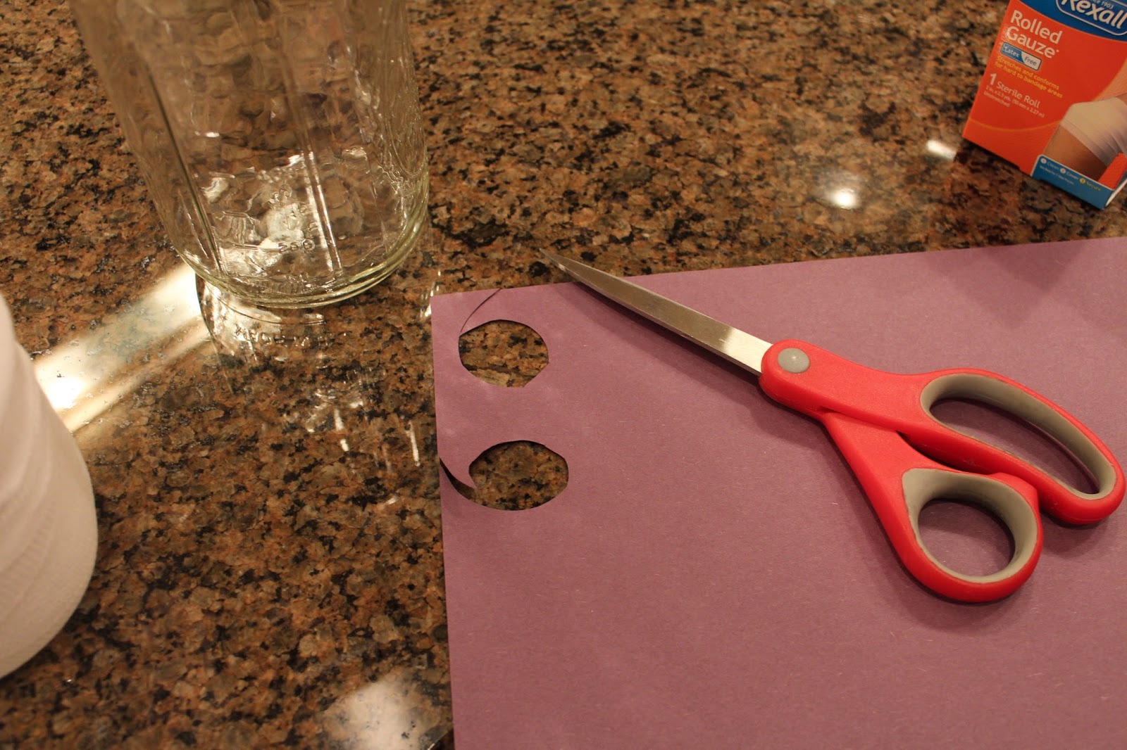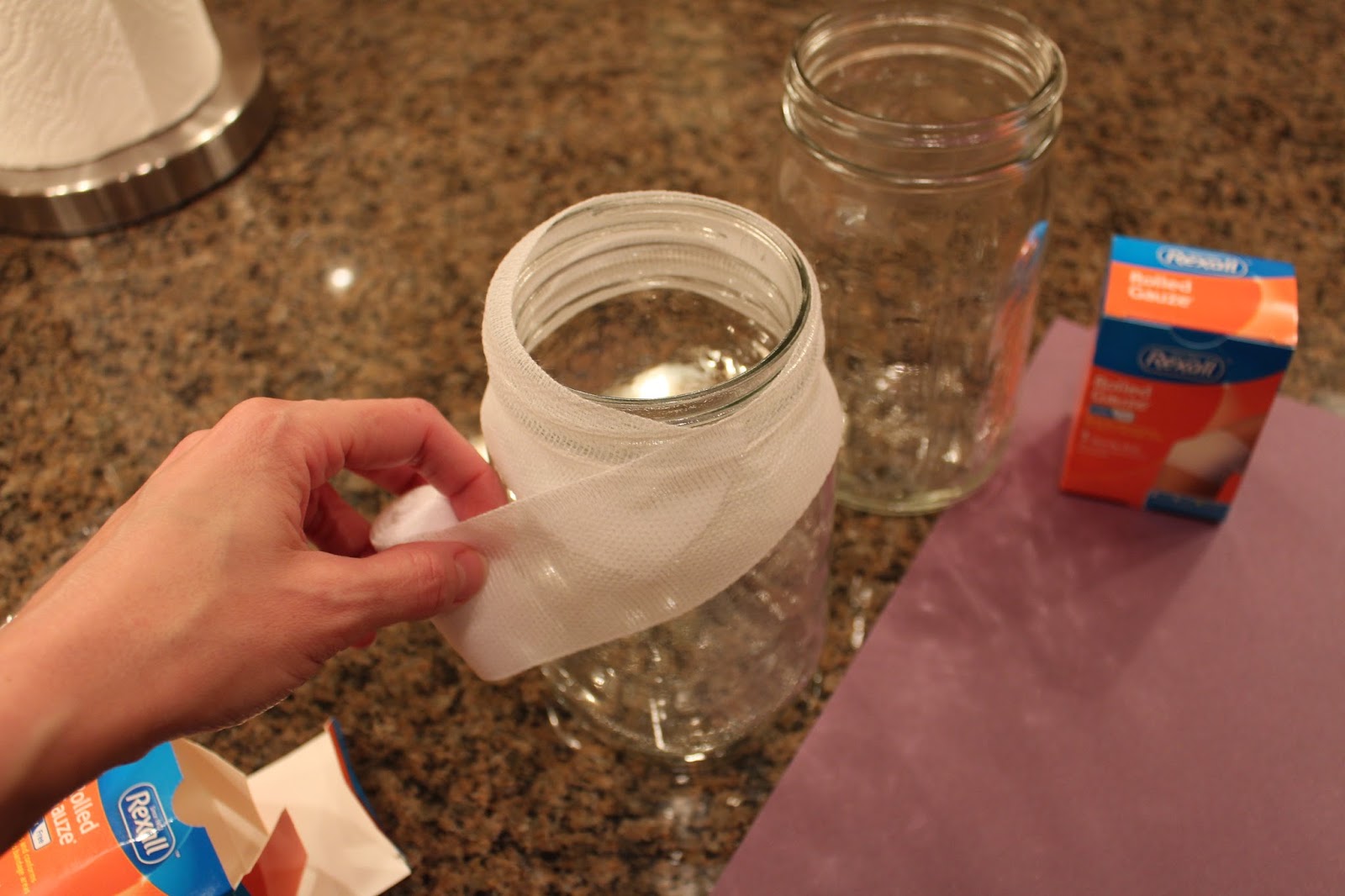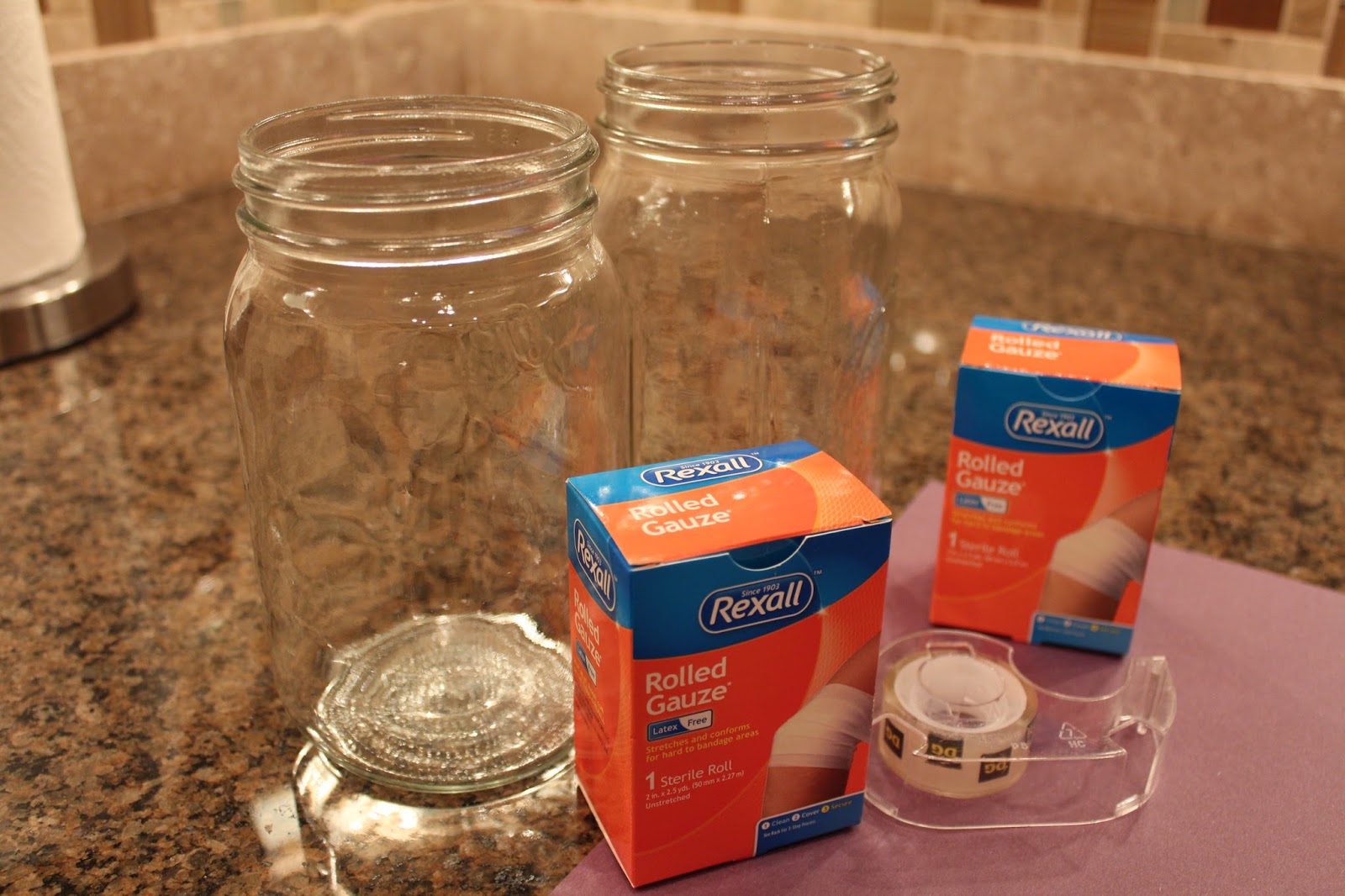 Unroll the roll of gauze and cut it in half. Wrap the gauze around the jar. I taped the first end to secure the gauze and put a small piece of tape on the final end to keep the gauze attached. It takes 30 seconds or less to wrap the jar. Don’t do it evenly, mummies are not symmetrical. Leave an open spot about 3/4 of the way up the jar on one side for the “eyes”.
