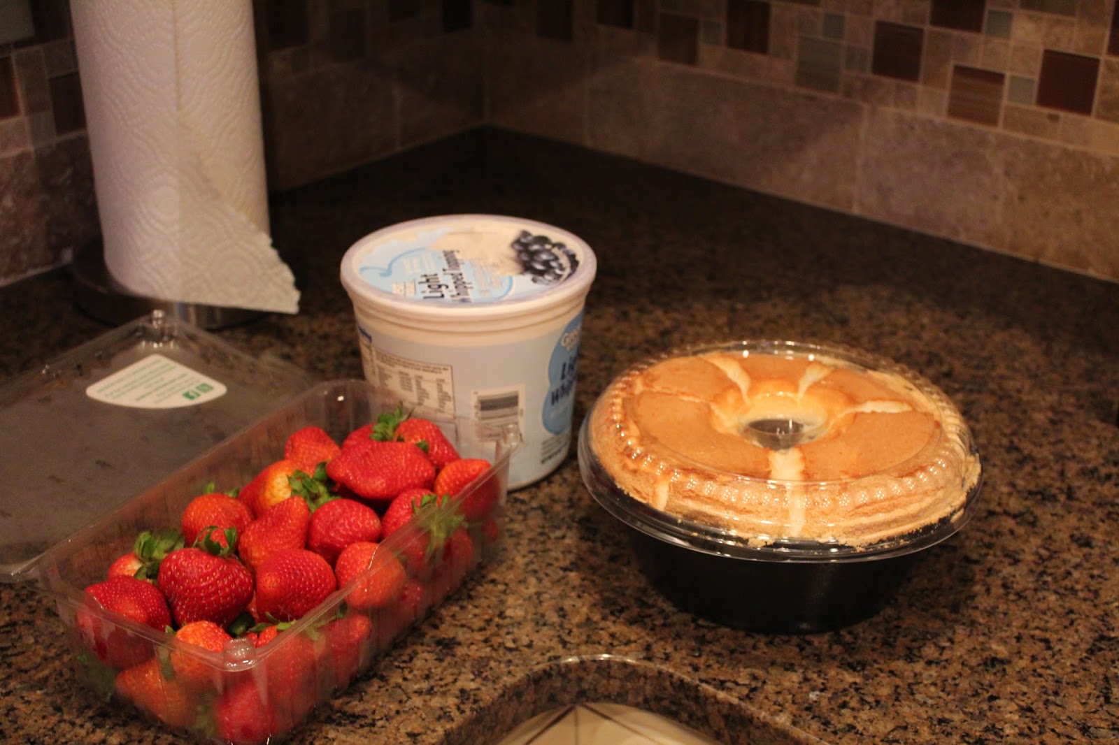 My ingredients cost about $5. I bought an Angel food cake ($2.50), whipped topping ($1), and a box of berries that I will use about half or less ($1). You could also make your own whipped cream, it’s up to you. Andddd, I’m ready to assemble. It’s that easy (and super easy on the waist line with very little fat).