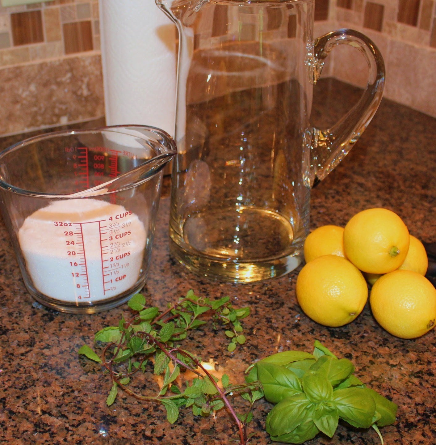 This recipe will make two gallons of lemonade. I used 10 very small lemons, 2 cups of sugar, water, and a handful of fresh mint and fresh basil from my plants. The investment is about $4 – and the lemons were not on sale. For measuring purposes, count on one cup of sugar per gallon and 1 1/2 cups of lemon juice per gallon. If you want to add more sugar or more lemons, add them. I don’t like syrupy sweet lemonade so this recipe isn’t overly sweet.