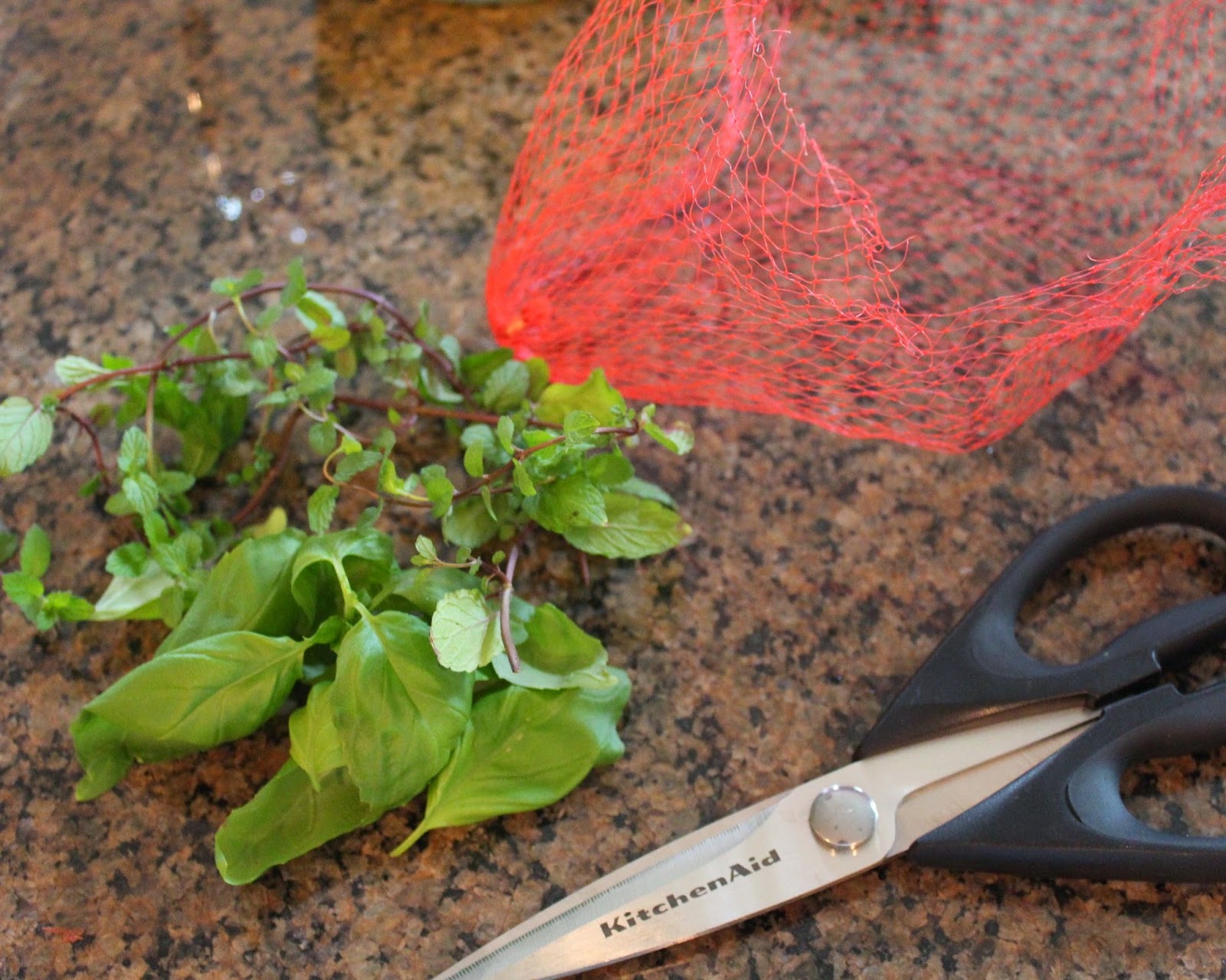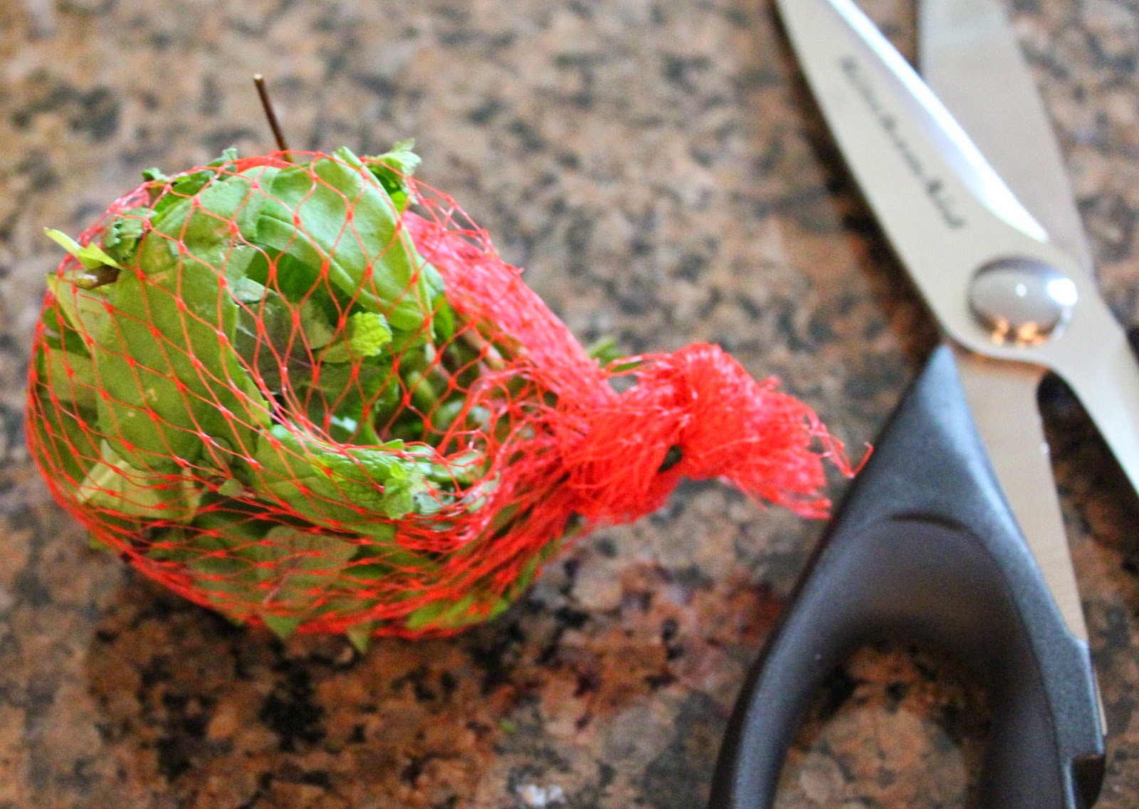 Make sachets of herbs to float in the lemonade. I used an onion bag. Some lemons come in a net bag so use whatever you have.