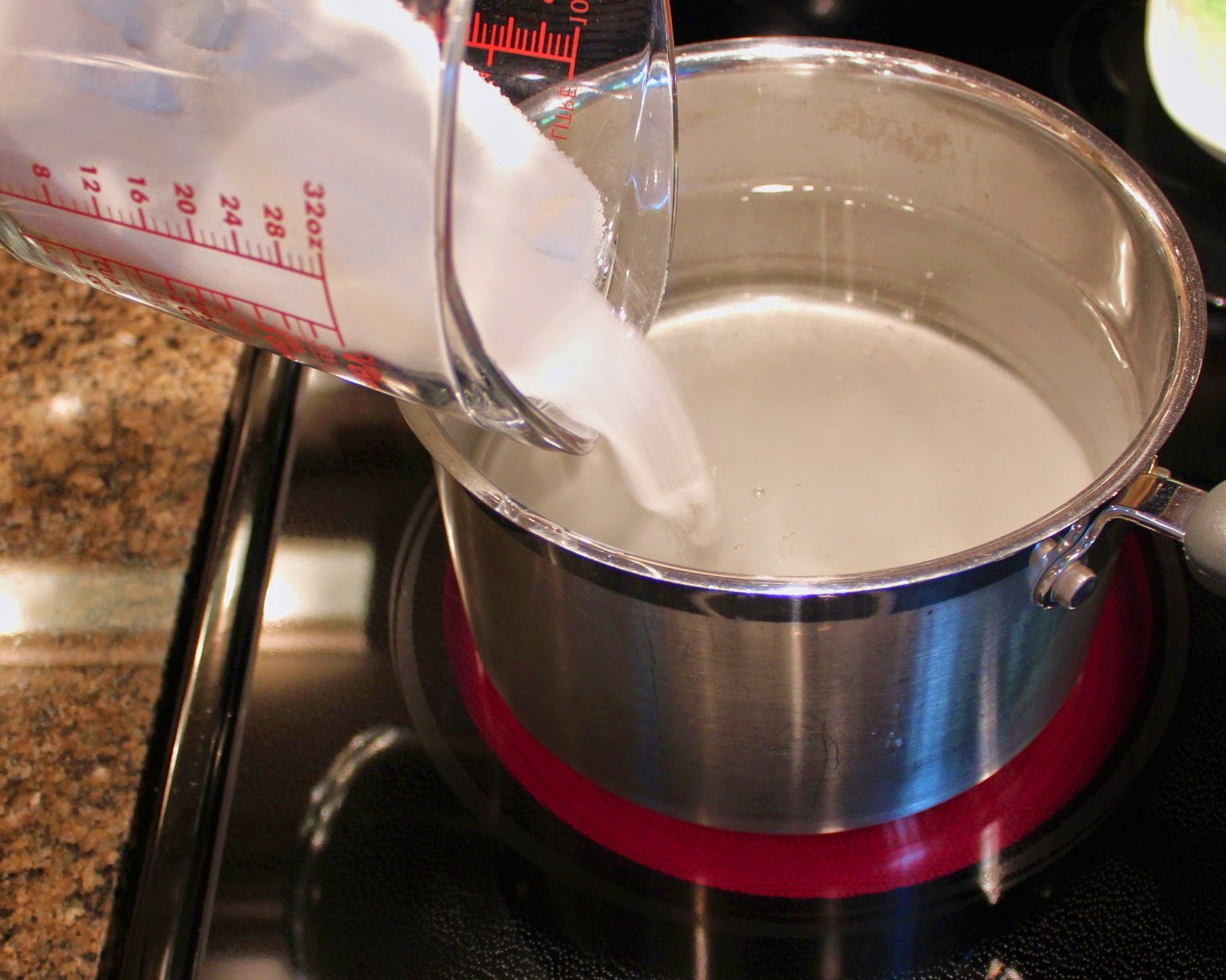 Begin by making a simple syrup with about 4 cups of water and the sugar. Slowly heat the water and pour the sugar in. Stir frequently until the sugar dissolves. Don’t let it burn. Once the sugar has dissolved, turn off the burner and set the pot aside.